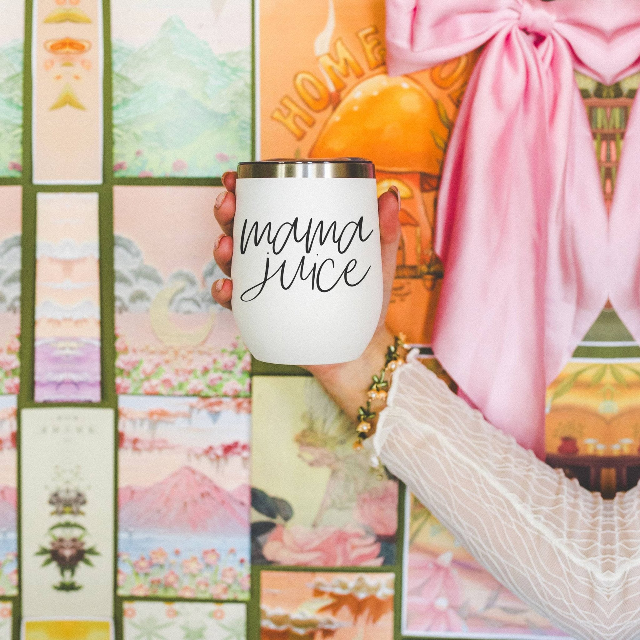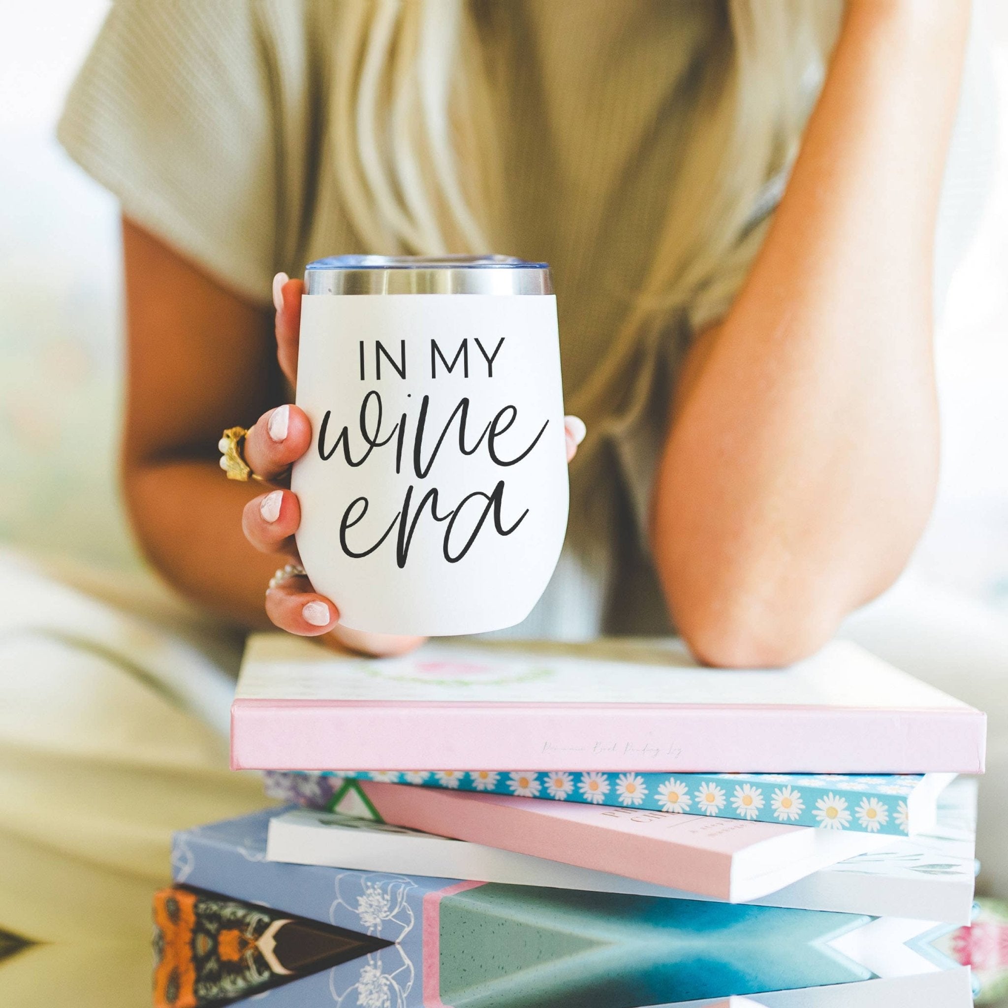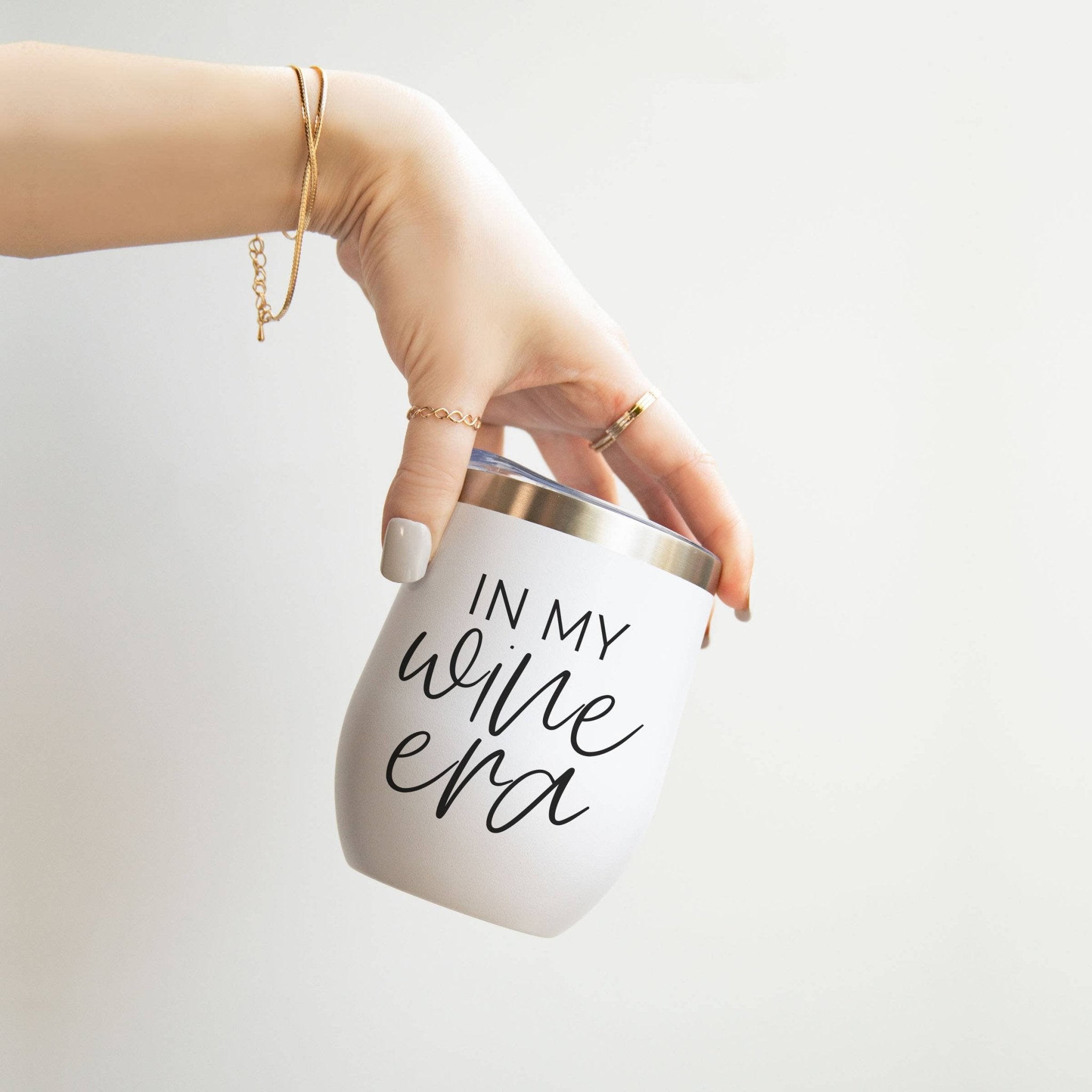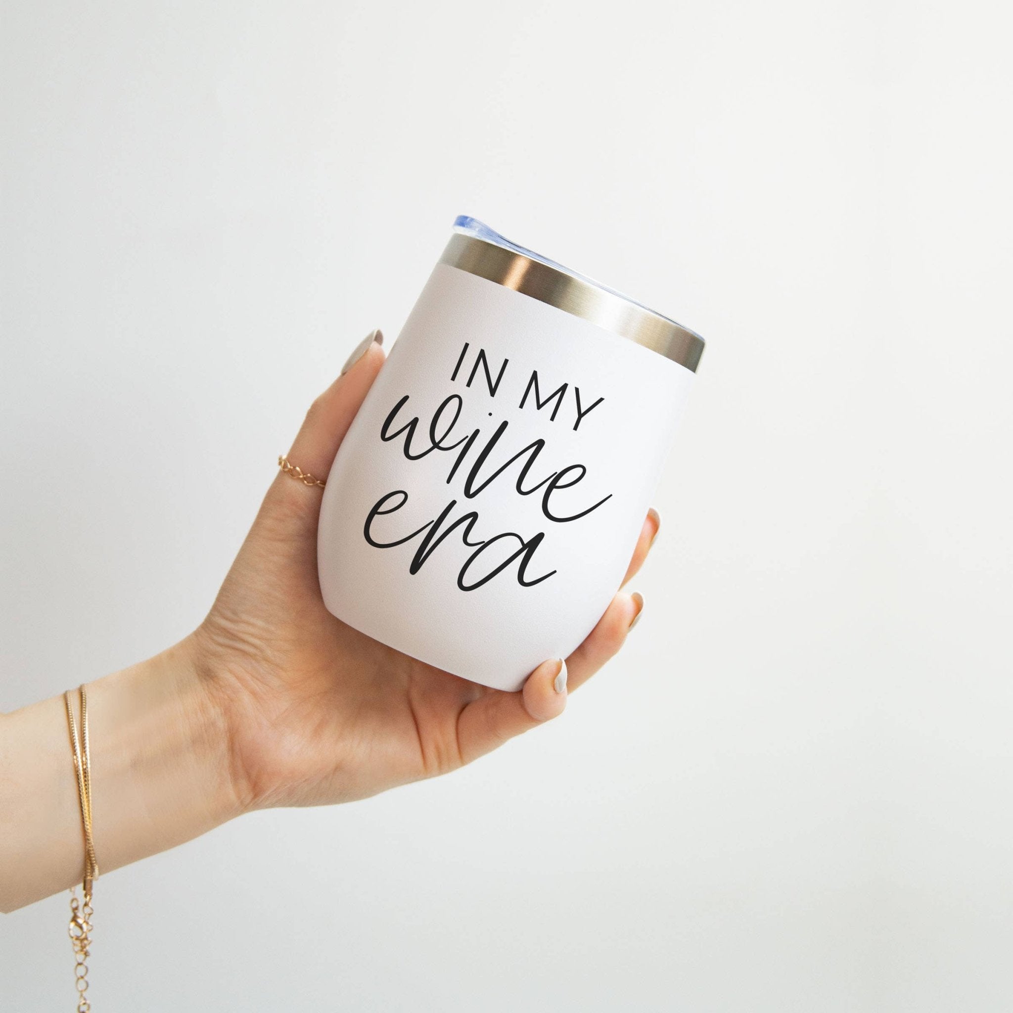 DETAILS: 12oz Stainless Steel Mug With Lid BPA, Lead + Phthalate Free Hand Designed by Gia Roma Design on Front, Blank on Back Dishwasher safe + Do Not Microwave Wash Before Use + Avoid Abrasive Cloths When Cleaning Use Caution With Hot Liquids Do Not Use to Store Milk, Baby Food or Carbonated Drinks Keeps Liquids Cold/Hot 8+ Hours White Exterior, Stainless Interior Clear Lid With Slide Closure In My Wine Era Wine Tumbler