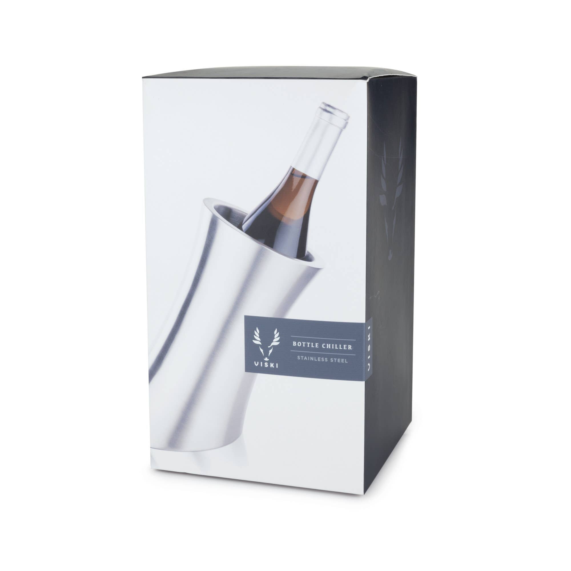 Angled and contoured to showcase wine with museum-worthy panache, our gleaming stainless steel bottle chiller is double-walled for full insulation and holds one standard bottle of white wine or bubbly until you're ready to pop the cork. Quantity: 1 bottle chiller Material: Stainless steel