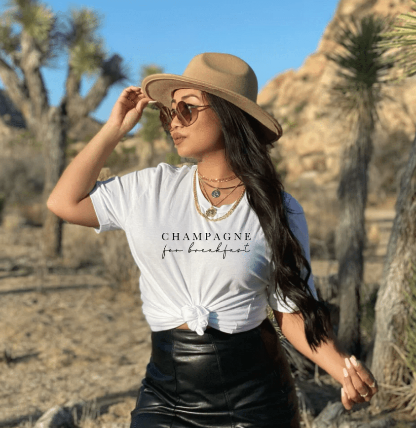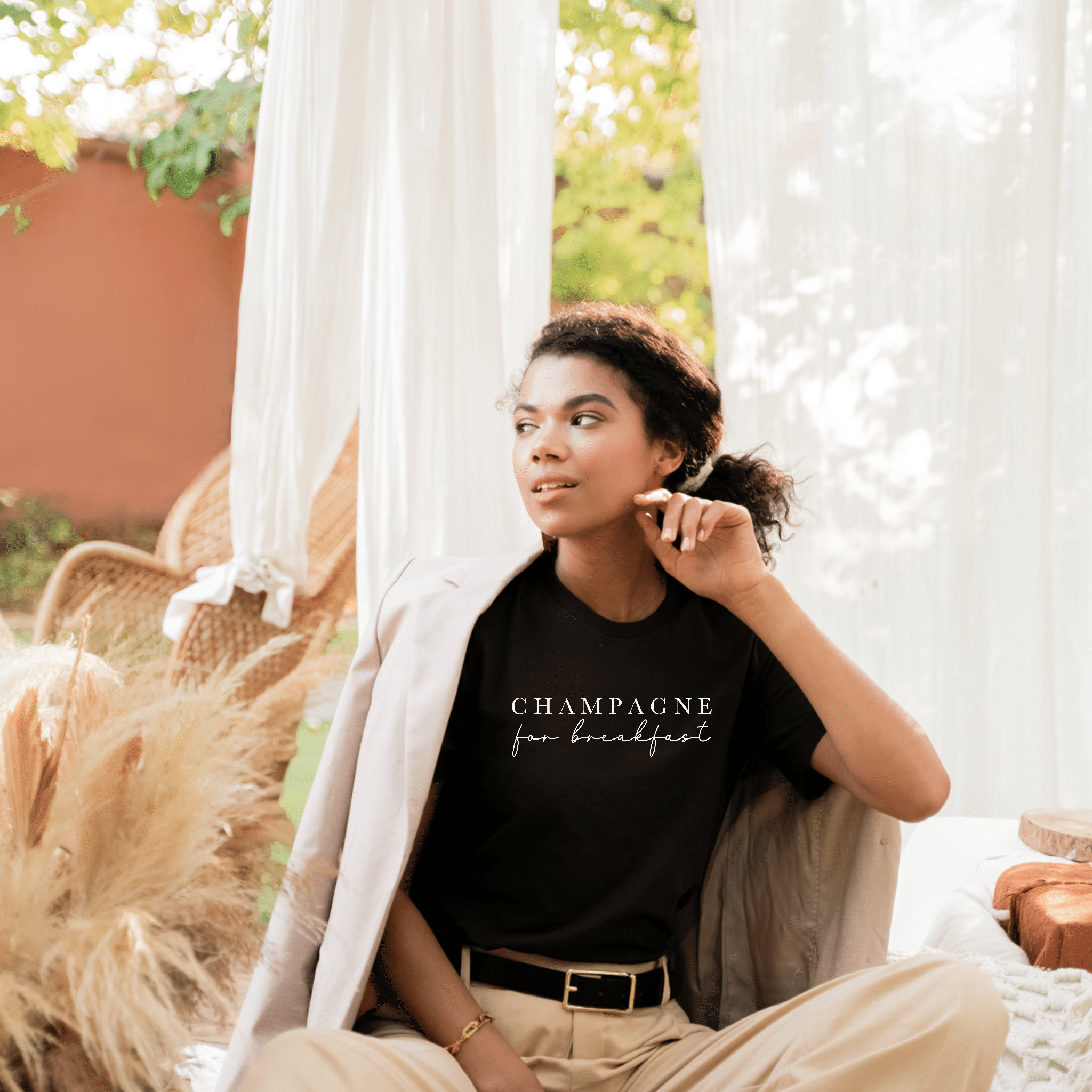 This Champagne for Breakfast T-shirt is the perfect gift for yourself or your favorite brunch lover. It's like drinking a mimosa in the morning. The timeless design of this T-shirt is versatile, and it can be worn with a ball cap or cute hat when you're shooting hoops or out having fun.