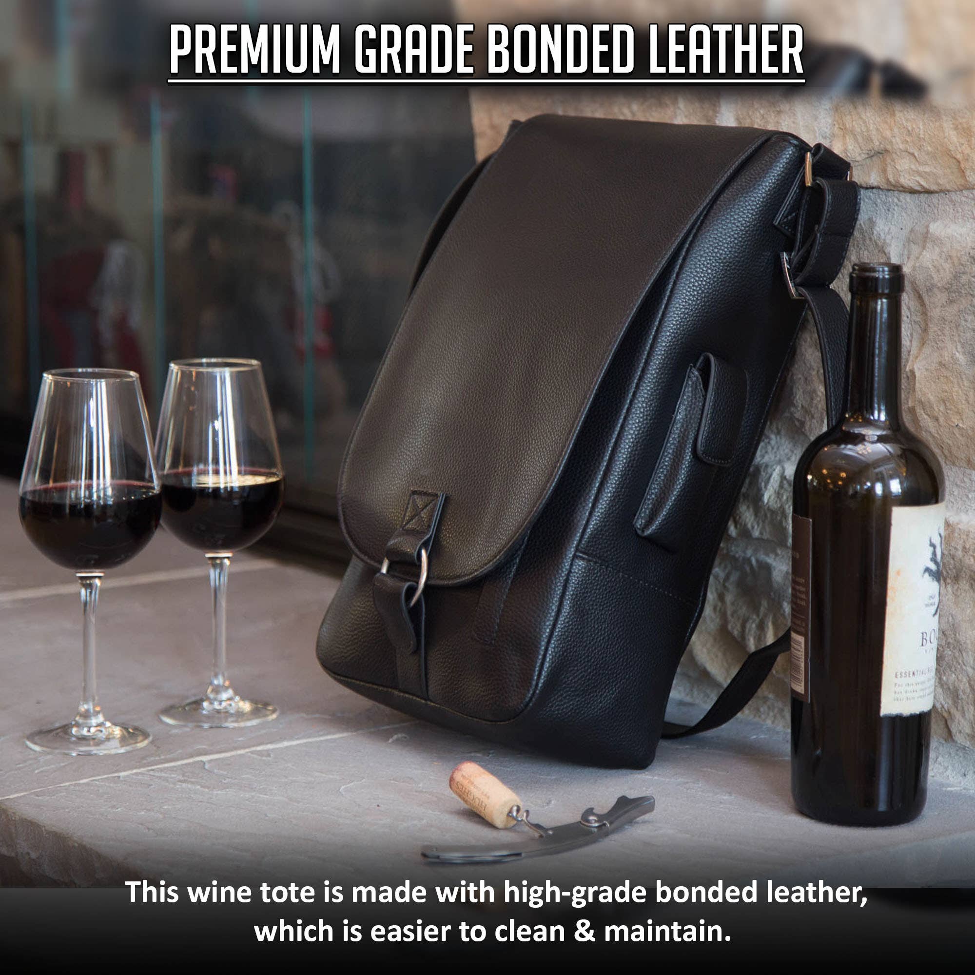 BOTTLES - Made from genuine leather this wine travel bag is sized to accommodate both standard-sized wine bottles and larger sparkling wine. PREMIUM GRADE Bonded Leather - This wine tote is made with high-grade bonded leather, which is easier to clean & maintain.