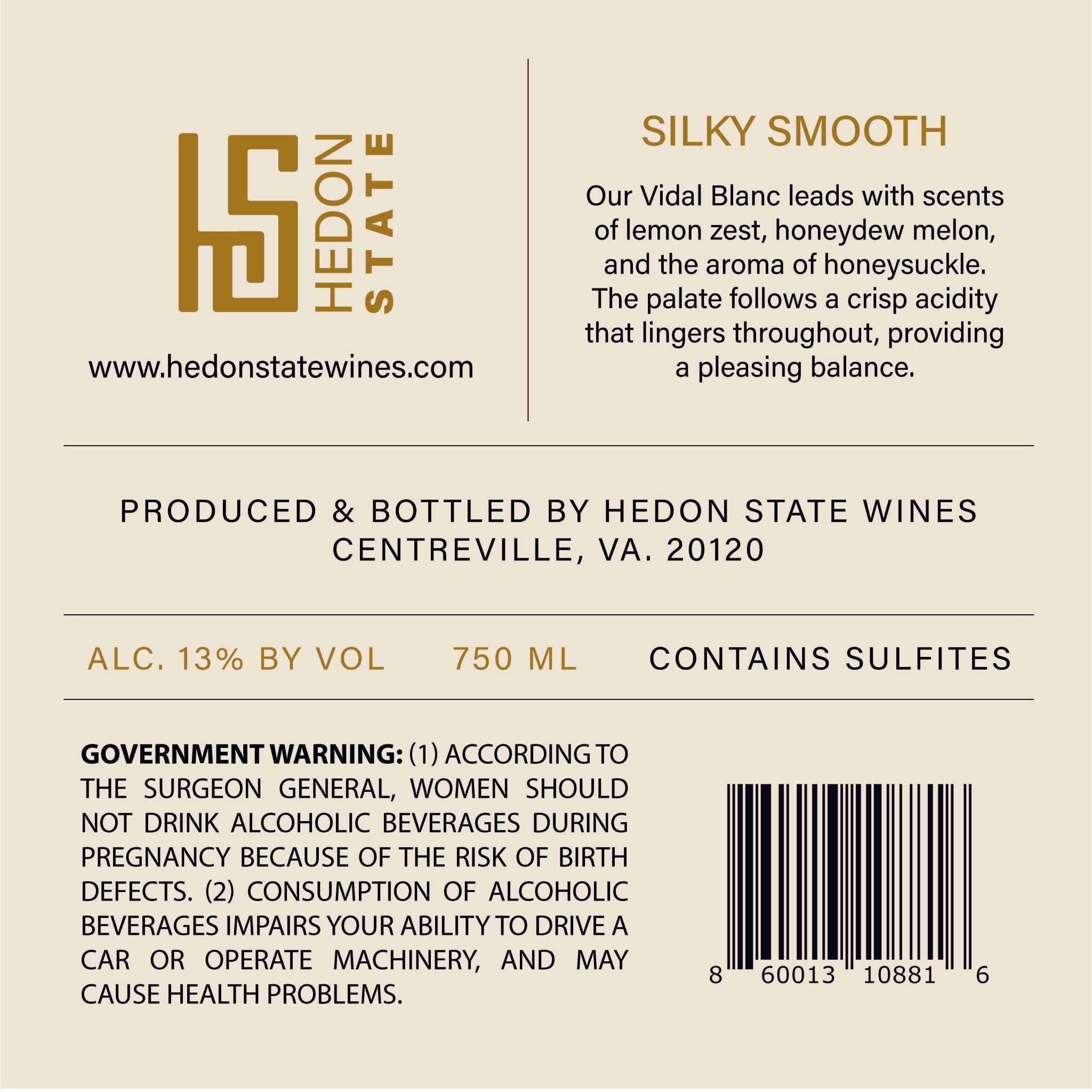 Hedon State's Vidal Blanc leads with scents of lemon zest, honeydew melon, and the aroma of honeysuckle. Its illusion of sweetness is accented with the taste of apricot and peach on the front palate and banana on the back, with crisp acidity that lingers throughout, providing a pleasing balance.
