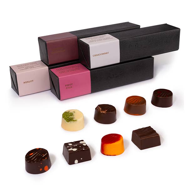 Flavors include: Dark Caramelized Pecan, Dark Vanilla Ganache, Dark Smoked Cherry Ganache, White Pineapple Lychee & Coconut Ganache, White Mint & Yuzu Ganache, 85% Dark Chocolate Ganache & Dark Sea Salt Ganache specifically paired for Pinot Noir, Merlot, Chardonnay & Cabernet Sauvignon